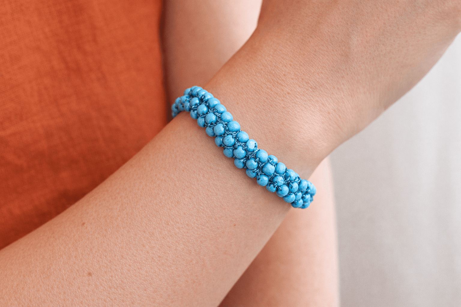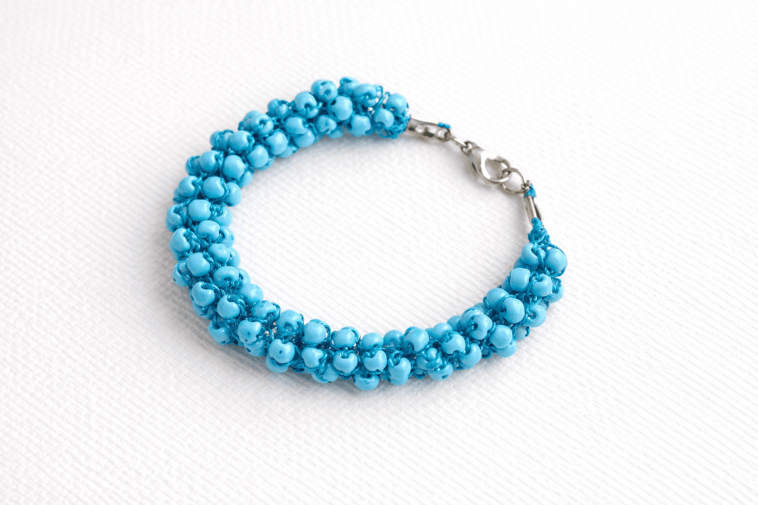 El yapımı bu bileklik, sentetik gök mavisi boncuklarla işlenmiştir. Yaklaşık 20 cm sabit ölçüdedir ve hafif yapısı sayesinde gün boyu konforlu kullanım sunar.