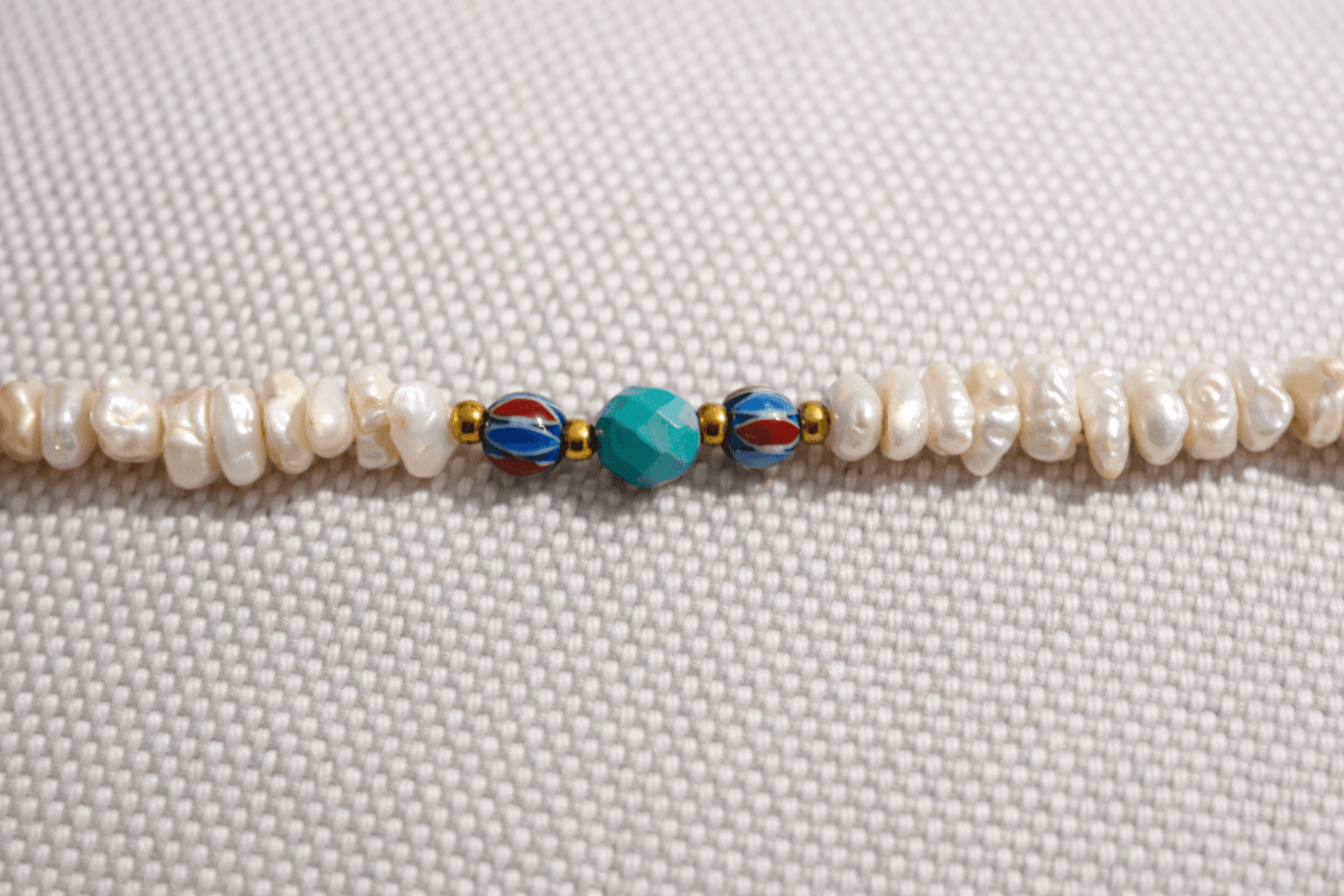 Bu bileklik, barok inci ve renkli cam boncuklarla özel olarak tasarlanmıştır.