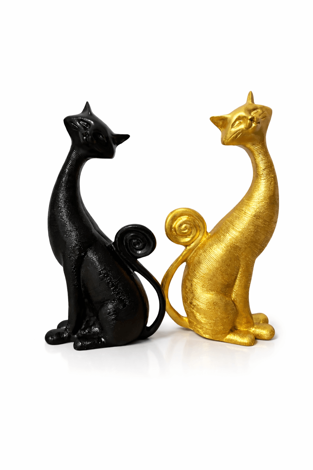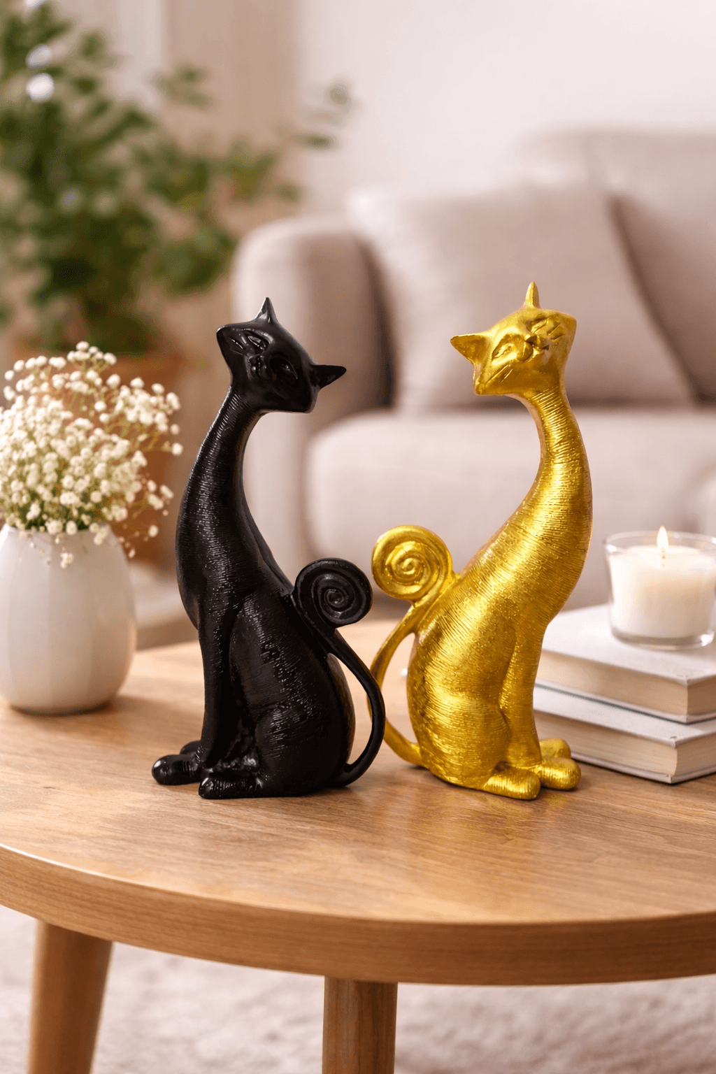 Altın ve siyah renklerin güçlü kontrastını yansıtan bu zarif kedi biblo seti, kalıplanmış özel form üzerine tamamen manuel olarak boyanmıştır. El boyaması olması sayesinde her bir parça kendine özgü doku ve renk geçişlerine sahiptir. Bu özellik, ürünü seri üretim dekor ürünlerinden ayırarak daha sanatsal ve koleksiyonluk bir hale getirir.