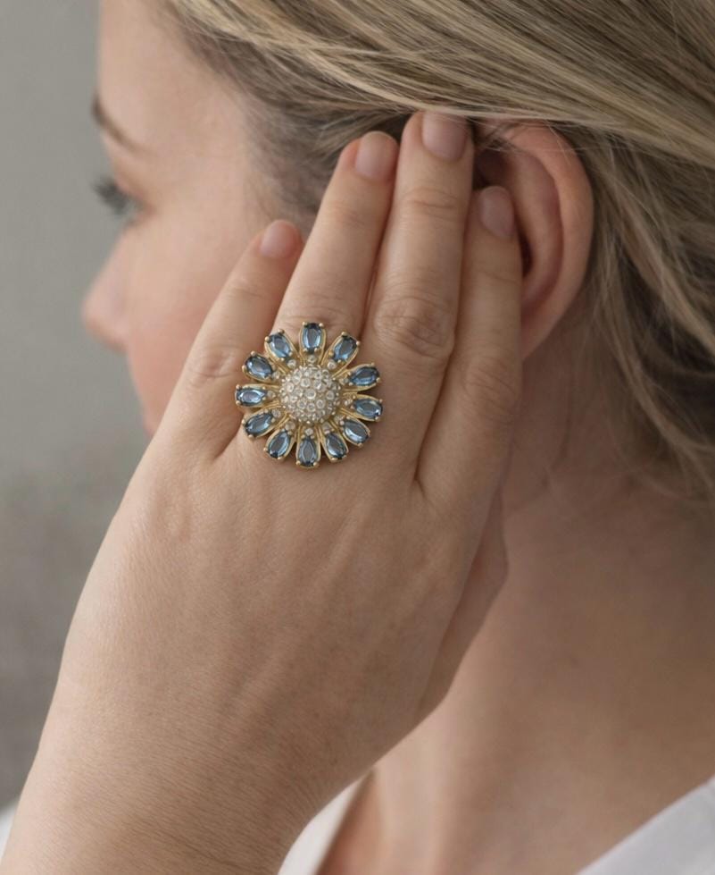 Mavi Taşlı Çiçek Tasarım 925 Ayar Gümüş Yüzük