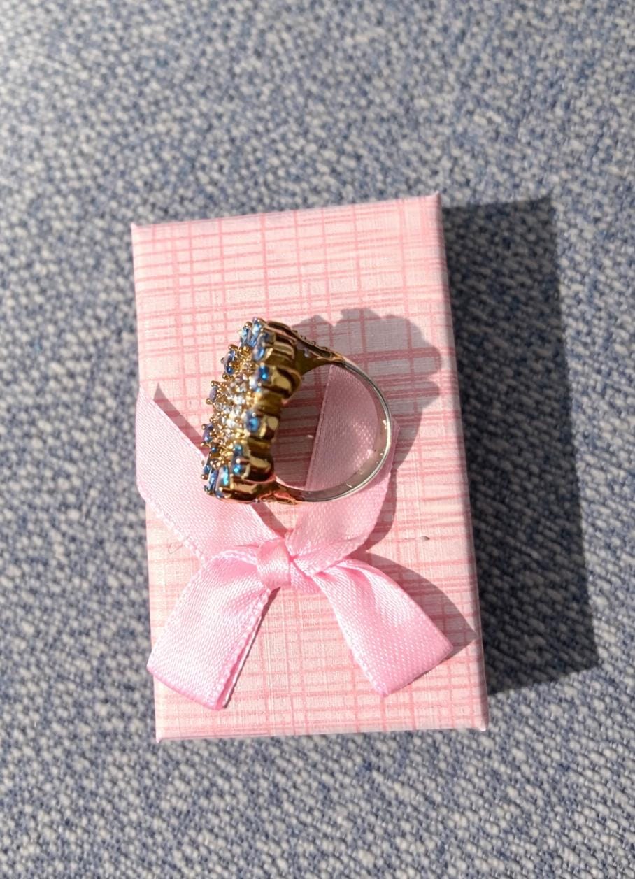 Mavi taş ve zirkon (CZ) detayları sayesinde zarif ve şık bir görünüm sunar.