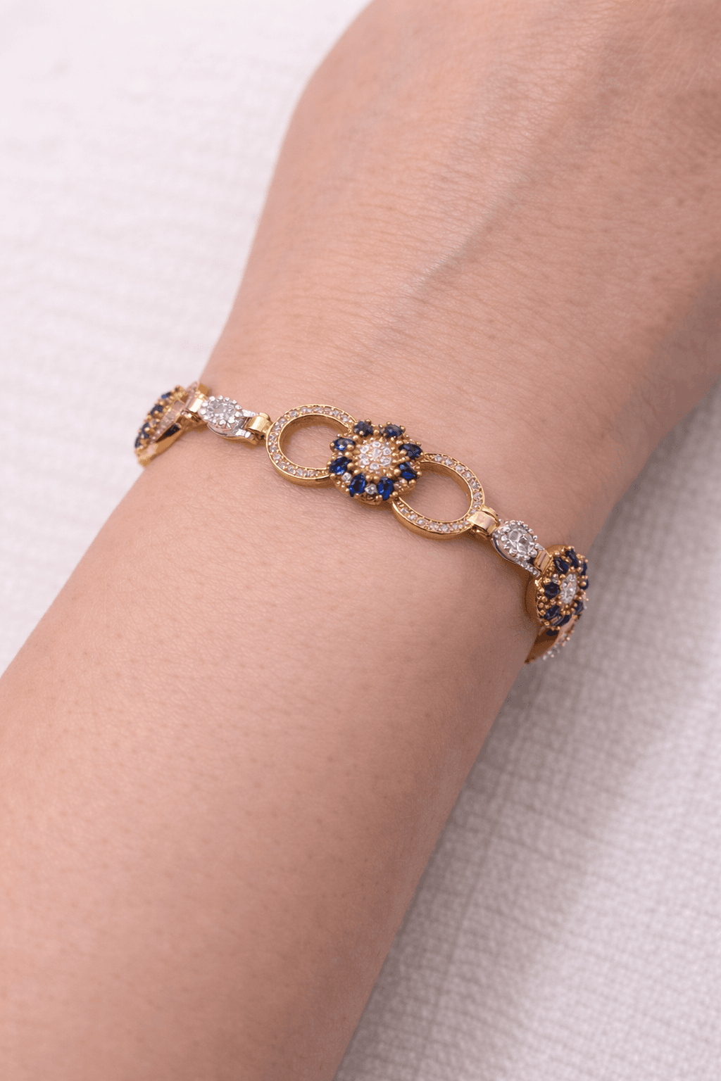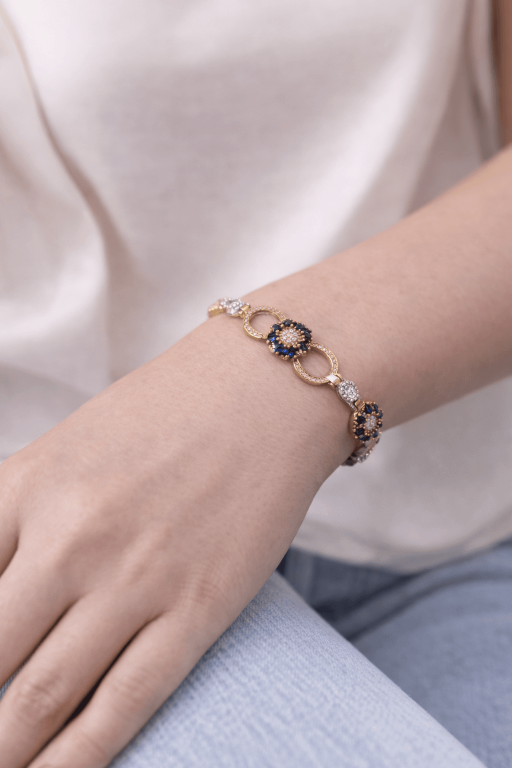 Yuvarlak ve çiçek formunu andıran taş yerleşimi, bileklik boyunca dengeli ve estetik bir duruş sunar. Vintage esintili detaylar sayesinde hem klasik hem modern kombinlerle uyum sağlar.