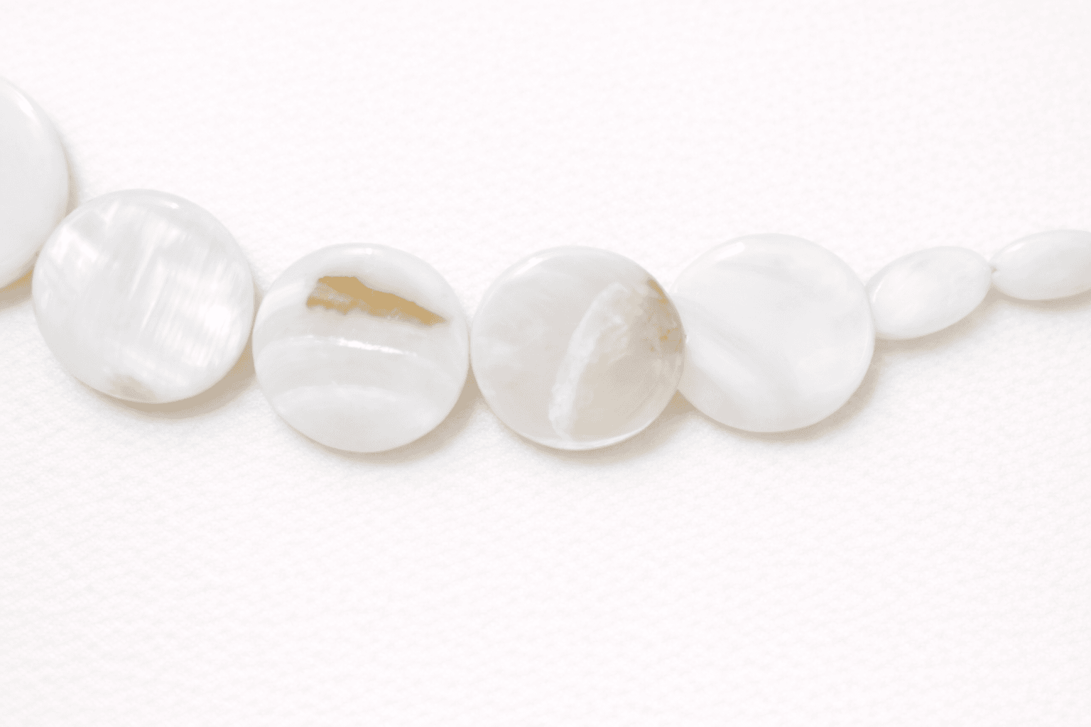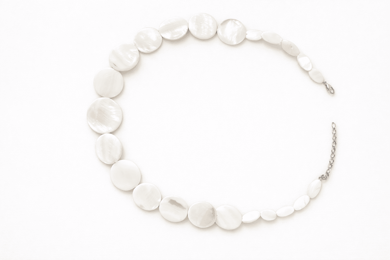 Doğal deniz kabuğu kökenli sedef disklerden el emeğiyle tasarlanmış özel üretim kolye.