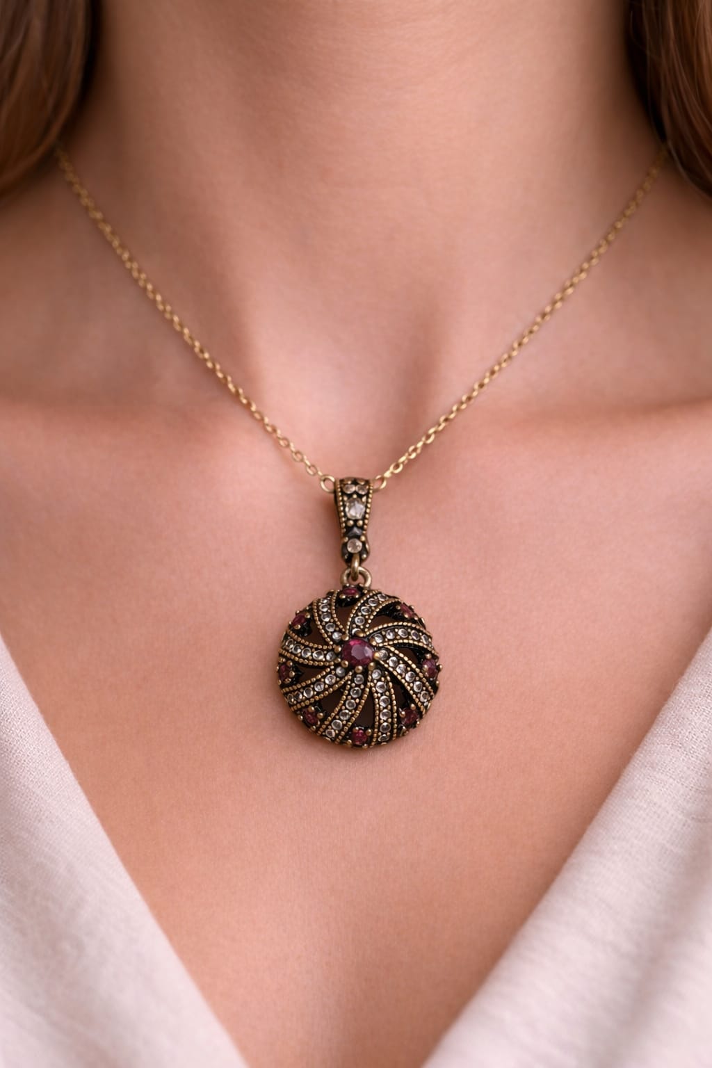 Zamansız şıklığı ve el işçiliğinin değerini bir araya getiren bu kolye ucu, bombeli yapısıyla derinlikli ve hacimli bir görünüm sunar. Yakut taşların sıcak ve güçlü tonu, Swarovski taşların parlaklığıyla dengelenmiş; bronzun sıcaklığı ve gümüş detaylar ile tamamlanmıştır. Yuvarlak ve bombeli formu sayesinde boyunda dolgun ve etkileyici bir duruş sergiler.